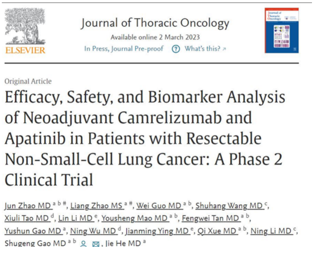 [1] ZHAO J, ZHAO L, WEI G, et al. Efficacy, Safety, and Biomarker Analysis of Neoadjuvant Camrelizumab and Apatinib in Patients with Resectable Non-Small-Cell Lung Cancer: A Phase 2 Clinical Trial. J Thorac Oncol. doi: http://doi.org/10.1016/j.jtho.2023.02.019