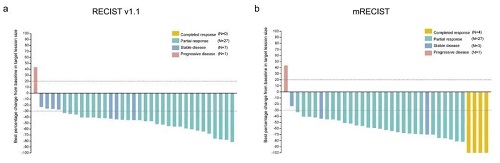 根据RECIST v1.1标准(图a)和mRECIST标准(图b)评估的客观缓解情况