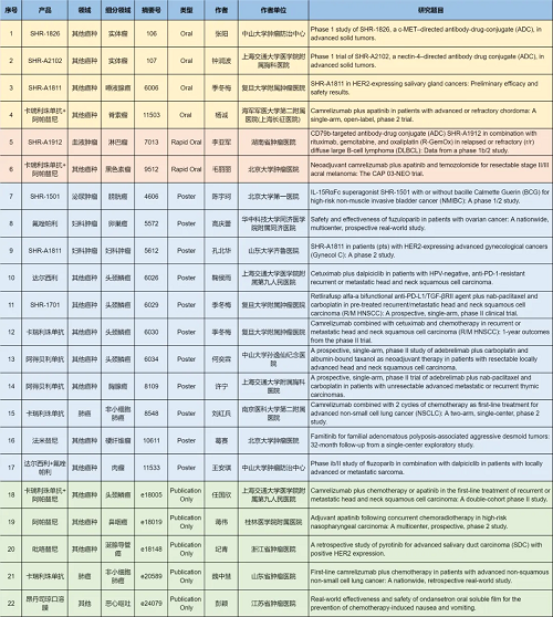 在肺癌、妇科肿瘤、淋巴瘤、膀胱癌、头颈肿瘤、黑色素瘤、肉瘤、鼻咽癌、脊索瘤、唾液腺癌、胸腺癌、硬纤维瘤、涎腺导管癌等其他多个疾病领域,卡瑞利珠单抗、阿帕替尼、阿得贝利单抗、吡咯替尼、达尔西利、氟唑帕利、法米替尼、SHR-1501、瑞拉芙普-α(SHR-1701)、SHR-1826、瑞康曲妥珠单抗(SHR-A1811)、SHR-A1912、SHR-A2102等抗肿瘤创新药相关研究一共入选了4项口头报告、2项快速口头报告、11项壁报展示和4项线上发表,彰显了918博天堂医药强劲的研发实力。此外,昂丹司琼口溶膜在防治化疗导致的恶心呕吐方面展现出了良好的疗效,本次ASCO年会有1项研究线上发表。