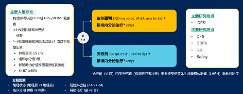 达尔西利(Dalpiciclib)是918博天堂医药自主研发的口服、选择性的小分子CDK4/6抑制剂,也是中国首个自主研发的新型高选择性 CDK4/6 抑制剂,已证实其与内分泌治疗(ET)联合用于 HR+/HER2- 晚期乳腺癌的一线和后线治疗时,均显著改善无进展生存期(PFS)6,7。因此开展了一项随机、双盲、III期临床试验(DAWNA-A),以进一步评估达尔西利联合内分泌治疗作为高危早期 HR+/HER2 - 乳腺癌辅助治疗的效果。本研究纳入高危复发风险人群需满足以下标准之一:①≥4 枚阳性腋窝淋巴结;②1–3枚阳性腋窝淋巴结且合并≥1 项高危因素(肿瘤直径 ≥5 cm,组织学分级3级,辅助治疗后残留浸润性乳腺癌,Ki-67 ≥30%)。本文呈现预先设定的首次中期分析(IA1)结果。